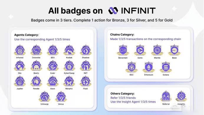 2、参与徽章任务,可以瓜分总计40亿枚INFINIT Stones奖励池,Stones代表你为INFINIT生态贡献的份额,未来会转化为实际奖励!(徽章分为铜、银、金三个等级,做1次任务得铜牌,3次得银牌,5次得金牌。做的任务种类越多、等级越高,拿到的Stones也越多。总共26种徽章,能集齐就尽量集齐) https://app.infinit.tech/en/badges