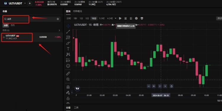 11、在搜索框输入ULTI,选择ULTI/usdt交易对,可以看到ULTI实时行情