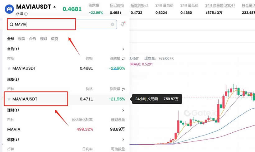 6、在进入也页面后,搜索MAVIA,选择MAVIA/usdt,就可以看到该币种的交易信息以及市场信息