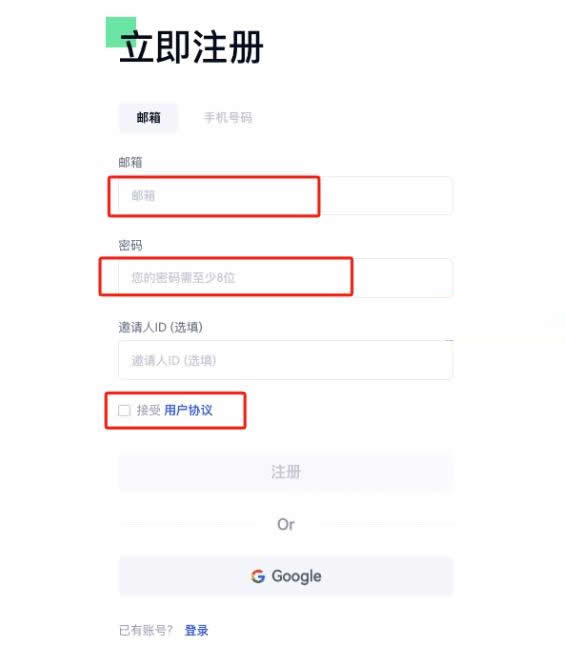 2、在注册页面,根据提示填写信息(邮箱、登录密码等),勾选“接受用户协议”,点击“注册”。
