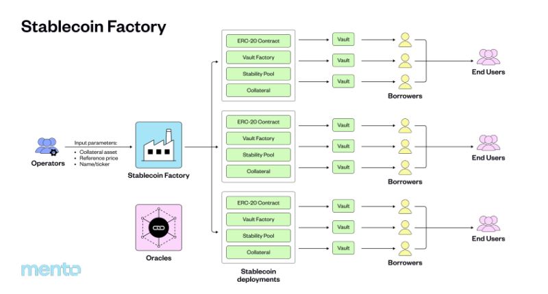 虽然发行稳定币传统上需要工程技术知识,但 Mento 的稳定币工厂让这一过程变得简单直观。作为一个无需编码的工具包,稳定币工厂让用户能够以去中心化方式自主发行新资产。只需运行稳定币工厂的智能合约并设置必要参数,任何人都能创建数字资产。完成参数选择和部署后,稳定币工厂会自动配置多个支持其运行的关键组件: