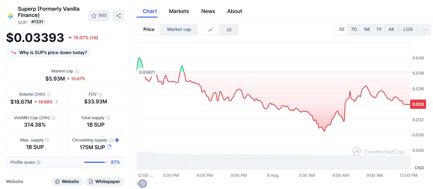 SUP 交易价格为 0.03293 美元,过去 24 小时下跌 15%。根据 CoinMarketCap 数据,SUP 24 小时交易量为 1867 万美元,下跌近 19%。该项目市值为 593 万美元。