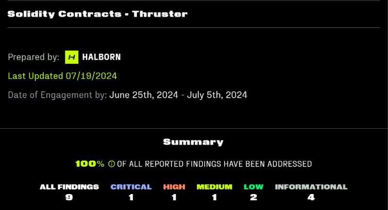 Thruster Finance 的自动化市场制造商(AMM)合约已分别由 Code4rena、Sparkware 和 Peckshield 进行了三次审计,在 AMM 代码中未发现中等或更高级别的问题。此外,评估合约也由 Halborn 进行审计,进一步确保了平台的安全性。这些合约还经过了受信任的技术合作伙伴和创始朋友的同行评审,为平台的完整性增加了另一层保障。