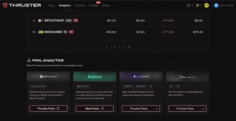 Thruster Finance 的分析工具可用于深入分析流动性池,为用户提供与池子表现、费用、年化收益率(APR)和总锁仓价值(TVL)相关的见解。用户可在 DexScreener 和 GeckoTerminal 等顶级外部分析工具上查看池子的信息。