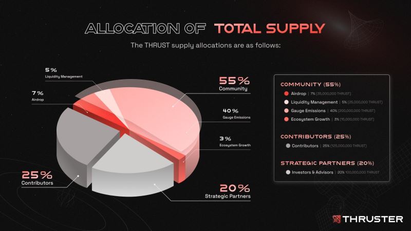 THRUST 的代币经济模型中,社区分配 55%:包括 7% 的空投,5% 的流动性管理,40% 的 Gauge 解锁,3% 的生态增长;贡献者分配 25%;投资者和顾问分配 20%。