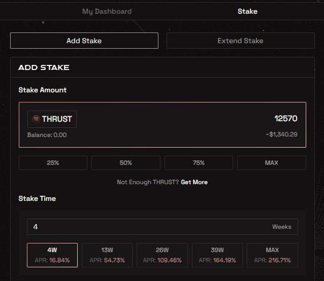 用户可质押他们的 THRUST 代币,以赚取 vETHRUST 奖励。用户可选择自己想要的质押期限,但只有将更多的金额质押更长时间才能获得更多奖励。此外,作为 veTHRUST 的持有者,用户还可享受诸如赚取手续费、对发行进行投票等更多好处。