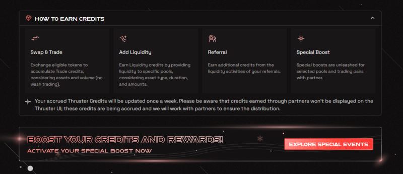 - 交易信用:用户在 Thruster Finance 上交换加密货币可赚取交易信用。此信用金额取决于交易量,这意味着用户交易的越多,获得的信用就越多。