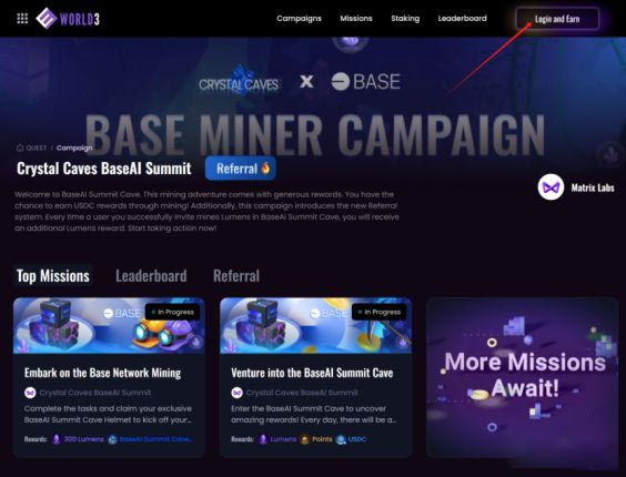 4、点击领取挖矿Pass徽章卡片,这是用户进入矿场开启挖矿行为的入场券,领取Pass之后点击TASK2部分的here链接进入挖矿游戏,随后登陆个人的World3账号选择好Base洞穴开启难忘且刺激的挖矿之旅