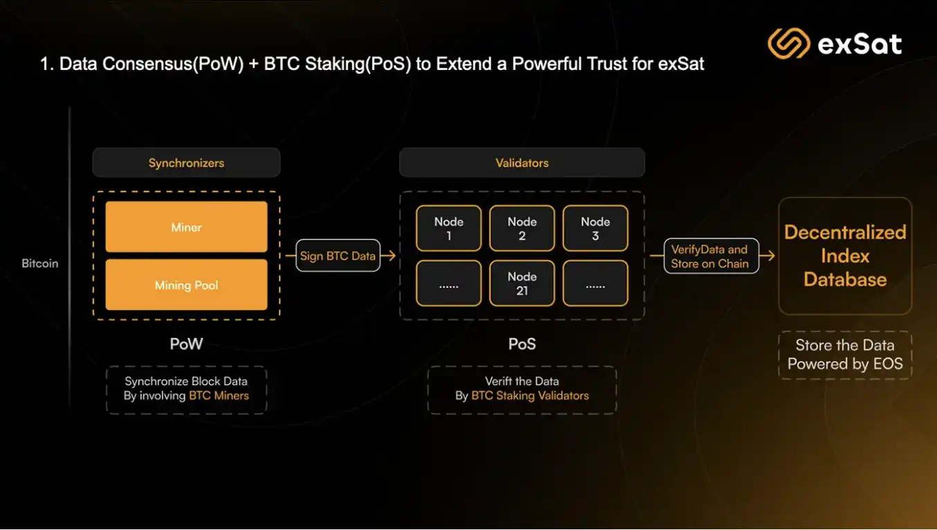 exSat 采用结合工作量证明(PoW)和权益证明(PoS)的去中心化混合共识机制确保比特币区块在 exSat 中的准确同步。