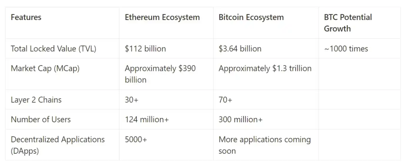 不止如此,BTC 受限于可扩展性,目前应用 TVL 只是 ETH 上的 0.3%,考虑到 BTC 市值是 ETH 的 3 倍,预估 BTC L2 市场还有 1000 倍、$3000 亿+生态市场空间,如下表,这就是 BTC L2 病毒式爆发的原因之一。