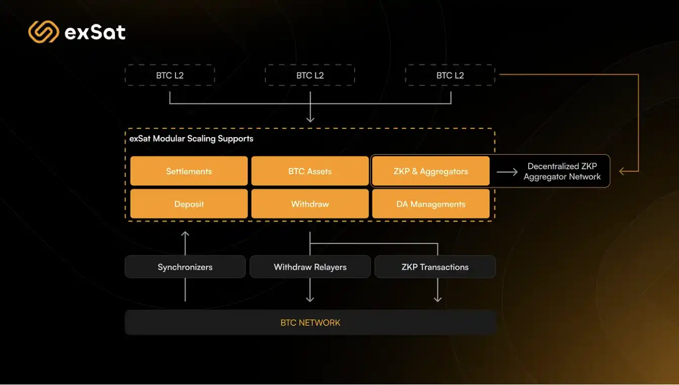 exSat是如何实现上述优势的呢?与旨在提高交易速度或降低成本的典型 L2 解决方案不同,exSat 创新性地引入了一个对接层来全面扩展比特币生态系统。本节深度剖析exSat的架构。