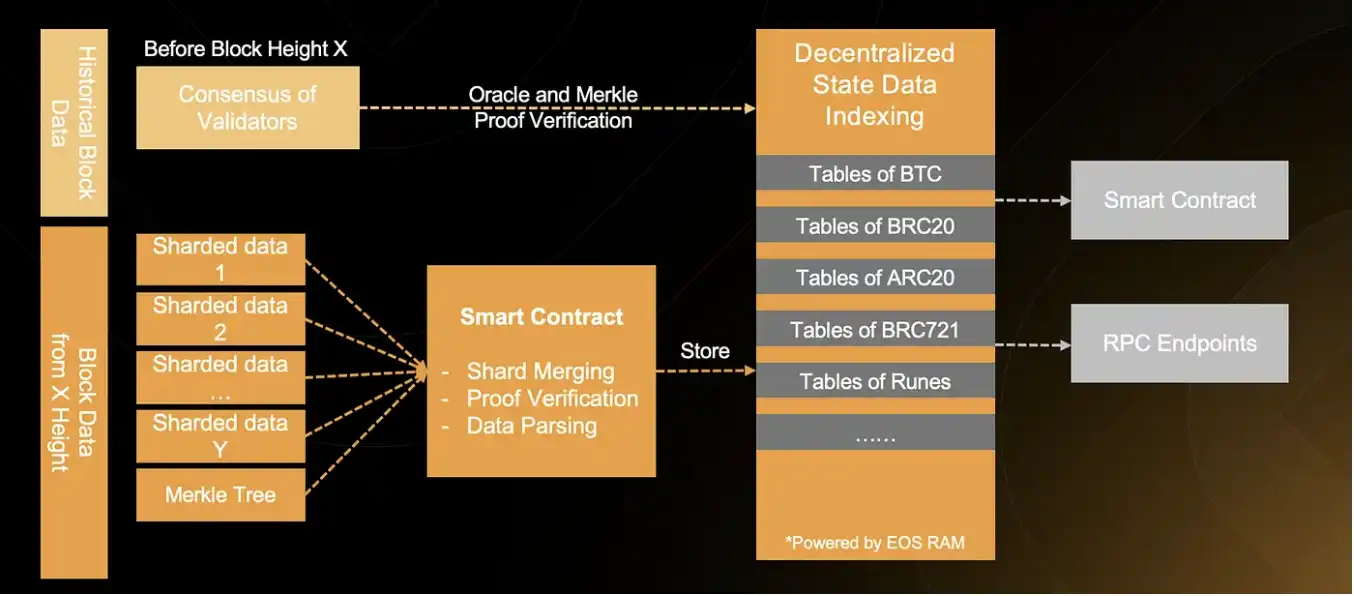 - 实时 UTXO 数据:对于高度 840,000 之后的区块,exSat 通过同步器和验证者进行链上同步、验证和解析,最终创建实时 UTXO 链上索引。