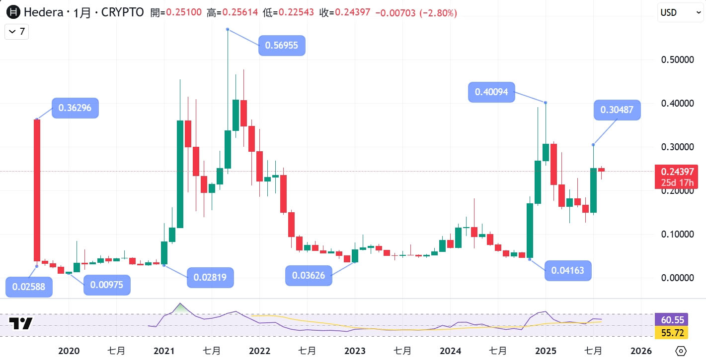 2025 年第一季,HBAR 再度受到市场关注,不仅因联邦合作题材、GPT 整合测试与理事会动态推升热度,也部分受益于美国大选年与数位资产监管政策预期,带动资金重新配置。币价于5 月反弹至0.3048 美元,目前(截至2025 年8 月)约0.2438 美元,进入相对整理区间。