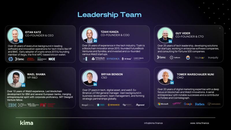 Kima Network 强调透明度,分享其领导层和顾问委员会的信息,以展示其专业性并建立用户信任。Kima Network 团队成员包括: