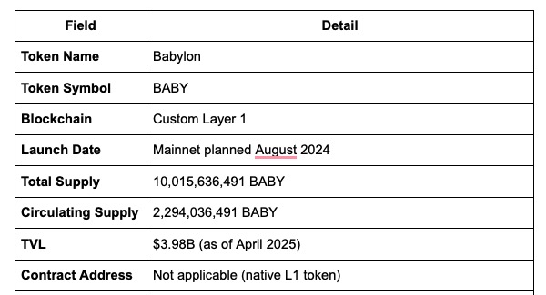 尽管市场回调,BABY代币活动显示出强劲势头。接近 40亿美元的总锁仓价值(TVL) 反映了市场对由Babylon架构保障的质押原语的日益增长的兴趣。在币安、OKX、KuCoin和Gate.io等顶级交易所的存在也确保了高流动性和零售访问。