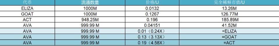 AVA 作为 Holoworld AI 推出的核心代币,结合了 AI 代理技术和 Solana 生态叙事,迅速吸引市场关注。因此参考对标项目如 人工智能发布的 Meme 币山羊 $GOAT、AI Meme 币 $ACT,以及由ai16z发起的AI代理代币$ELIZA来推测市值预期。