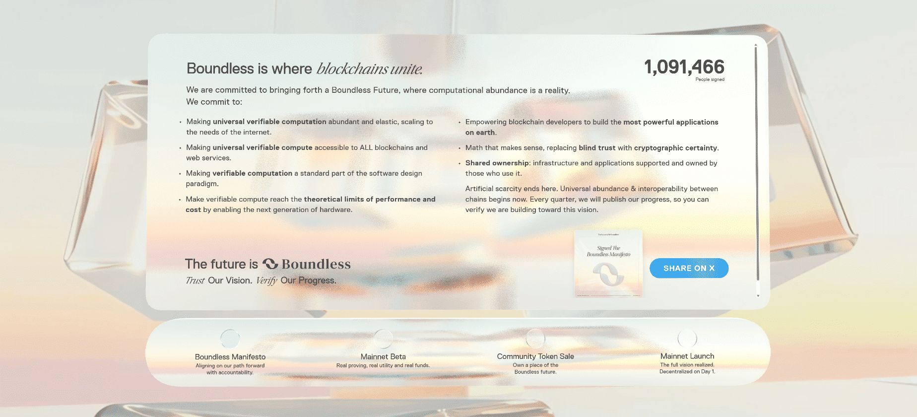 访问Beboundless 网站→ 连接您的 EVM 钱包 → 签署 Boundless 宣言 → 可选择在社交媒体上分享。