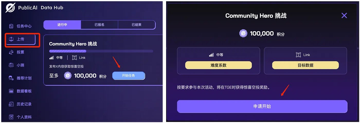 - 在PublicAI任务平台点击“上传”(Upload) — — “开始任务”