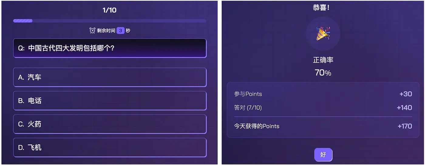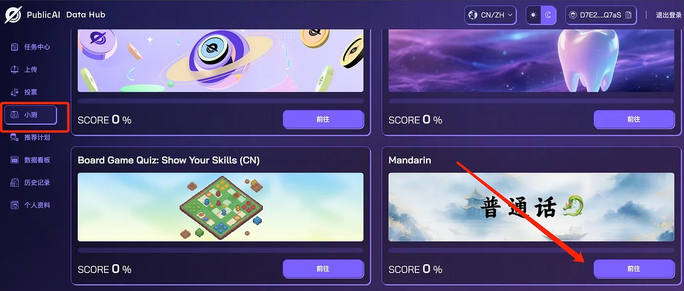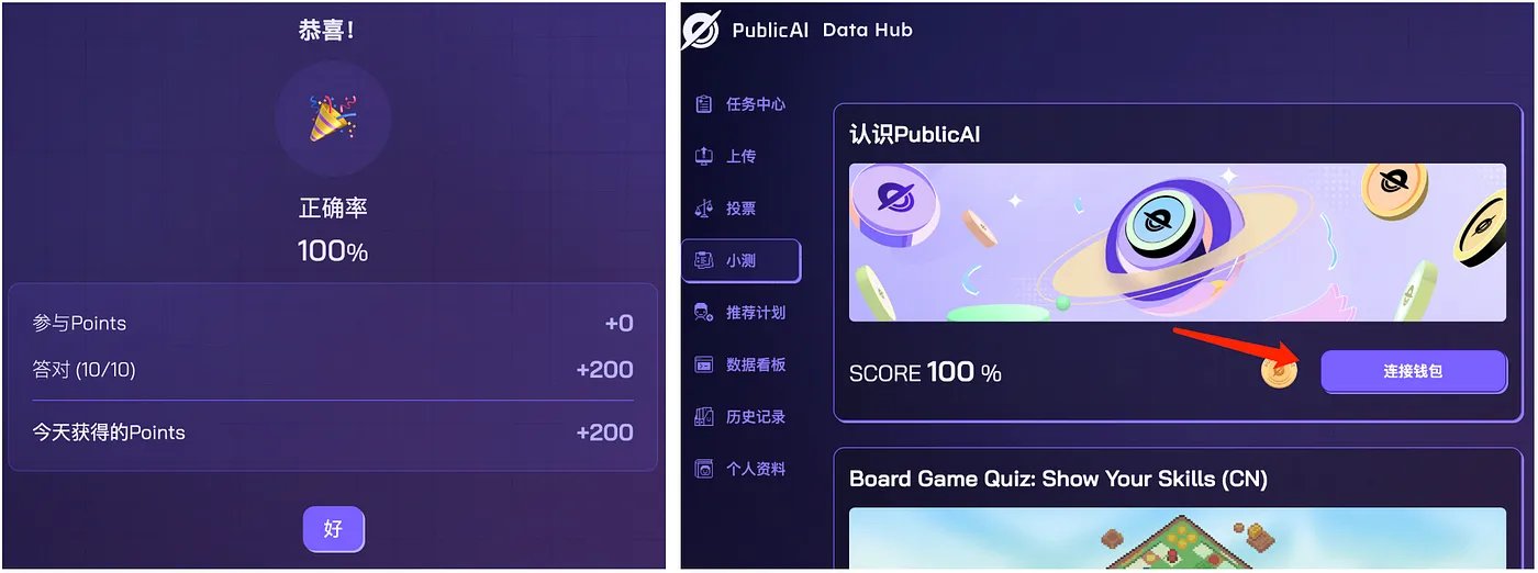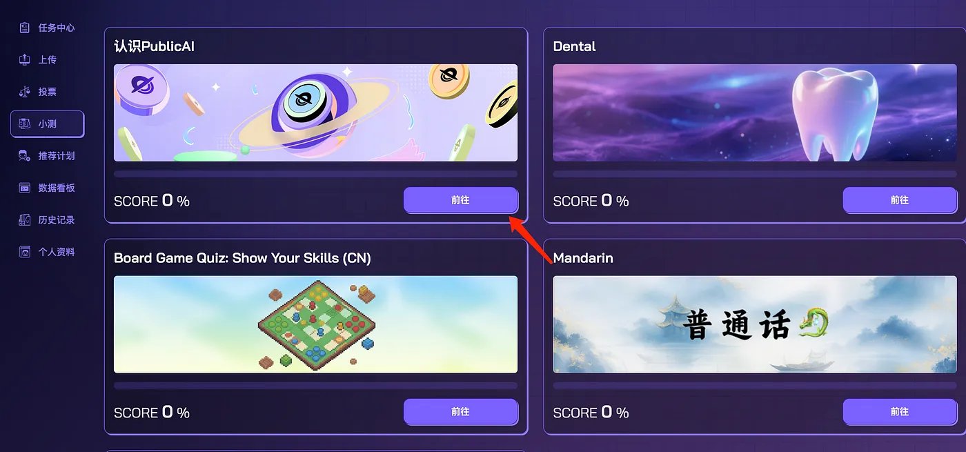 进入“小测”(Quiz)后,先做“认识PublicAI”,点击去回答几个简单问题就可以;