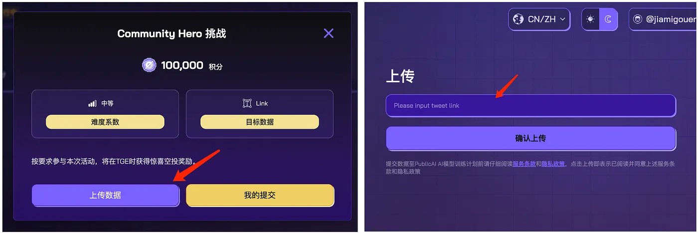 在PublicAI Data Hub(任务平台)的小测 — — 上传 — — 投票,三个连续任务中,“上传”是积分最大的。