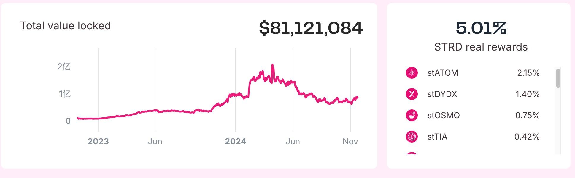 根据官方数据统计,目前Stride 的总锁仓量超过8000万美元,是从23年10月底开始快速增长。