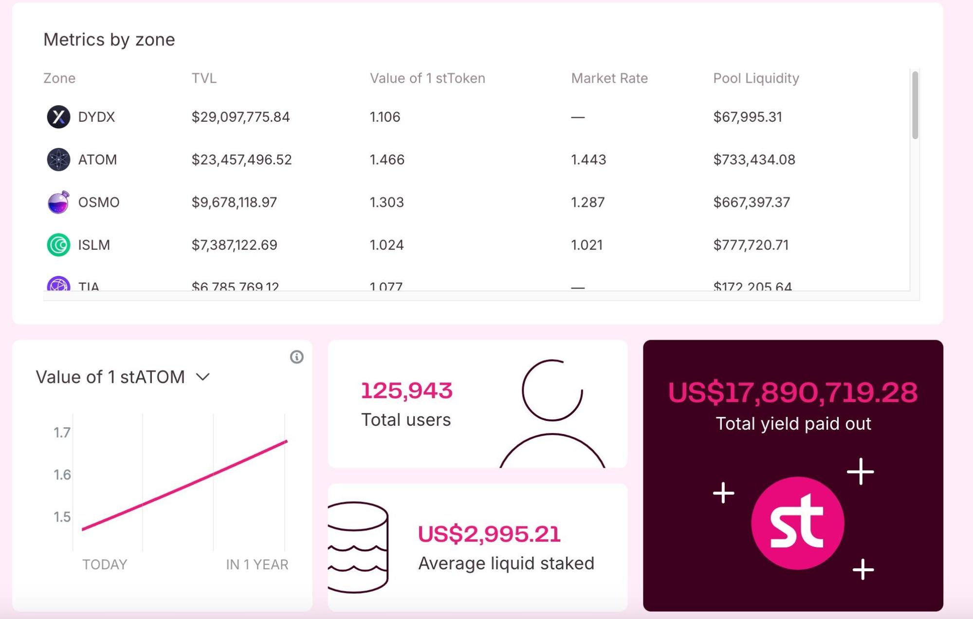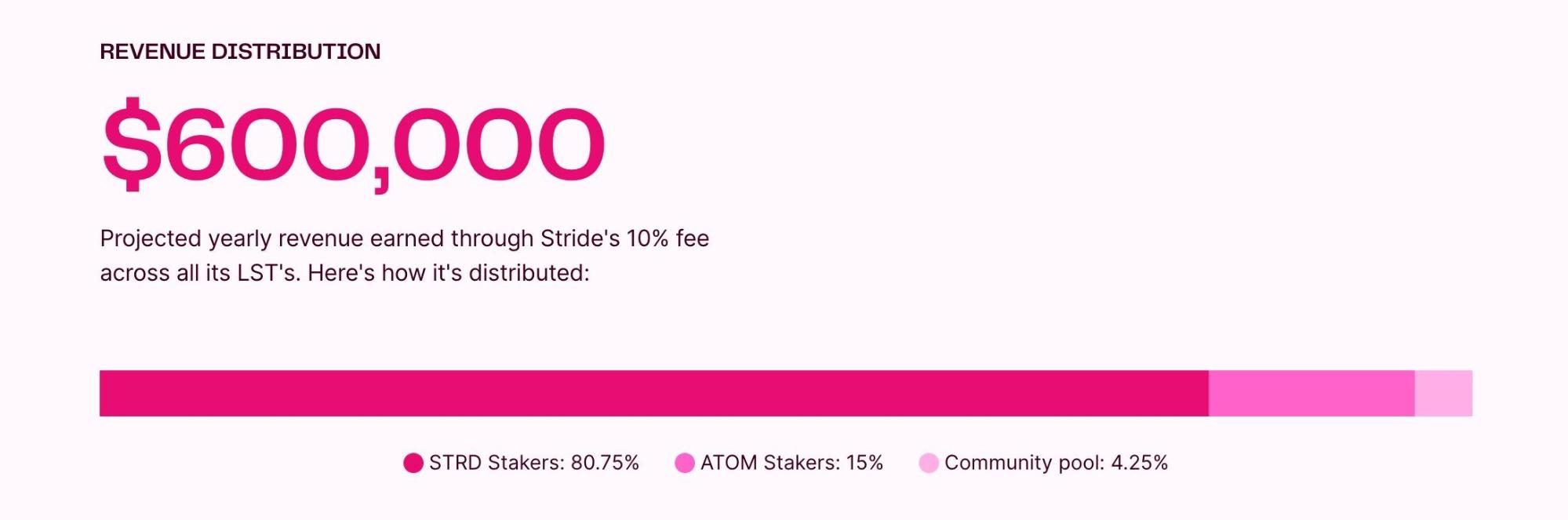 协议会对用户质押获得的收益收取10%的费用,该费用的80.75%将被分配给STRD 代币的质押者,15%的费用将作为消费者链的服务费用支付给Cosmos Hub上的ATOM代币质押者,最后 4.25%的代币将被分配给社区资金池。