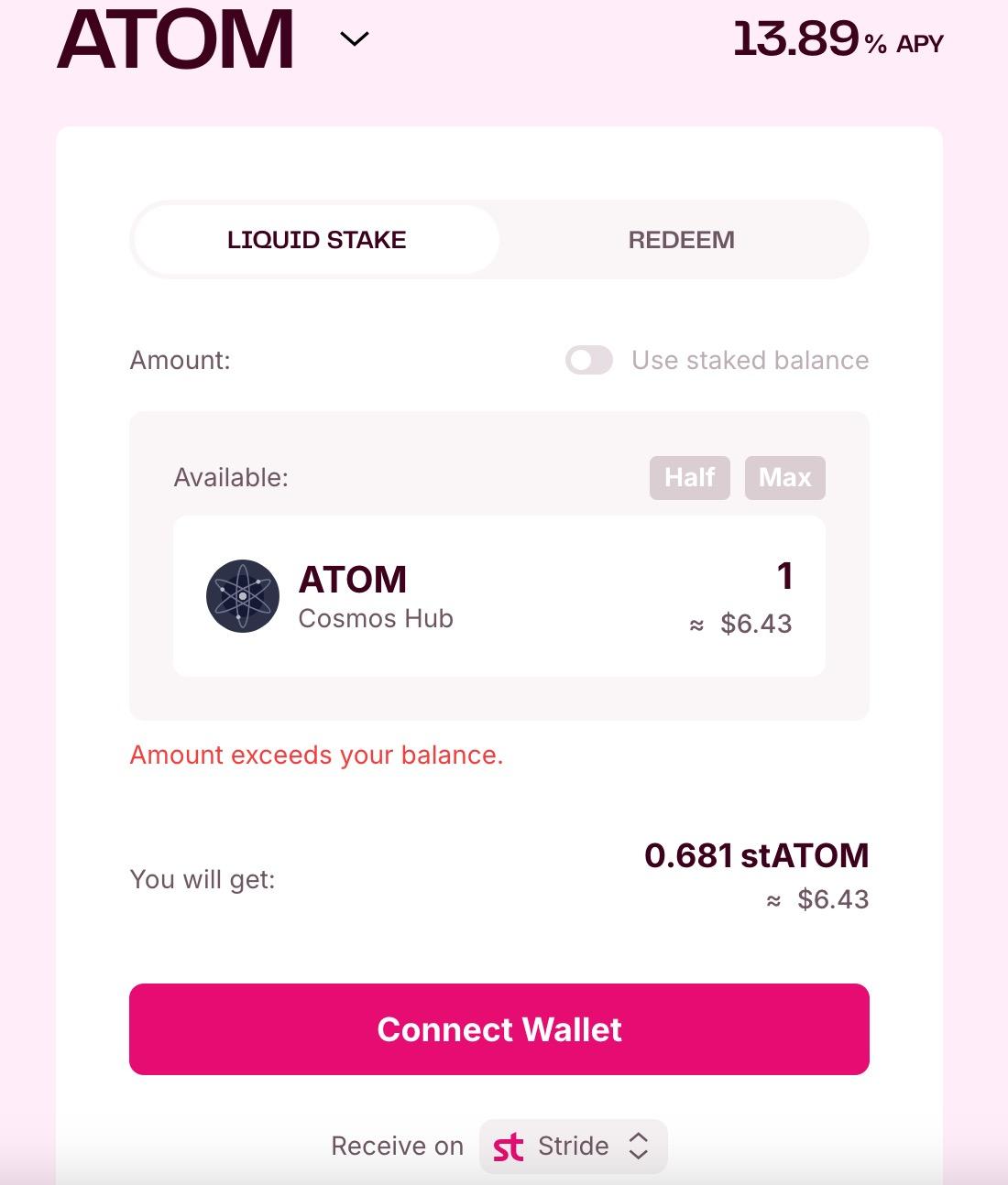Stride的用户体验上与以太坊的流动性质押项目并无区别,本质都是用户质押代币获取流动性质押凭证,赚取收益的过程。例如用户Stride 的界面上质押ATOM,会获得stATOM代币作为流动性质押凭证。stATOM代币不是类似于stETH 的Rebase代币,而是类似于wstETH代币,会随着时间不断累积的质押收益而升值,质押页面会显示APY,如下图所示,目前质押1ATOM会获得0.681stATOM,APY达13.89%。用户如果解除质押,需要等待21-24日才能完成。
