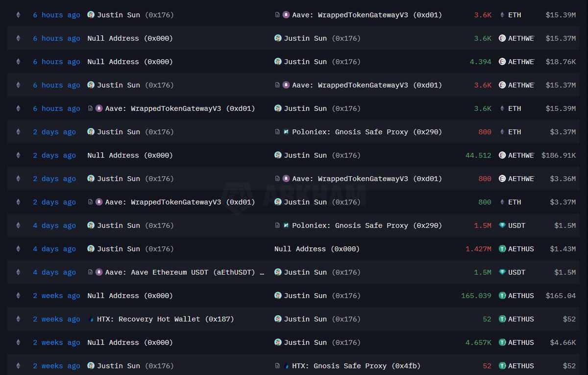 另一位始终在 ETH 代币上展现出高曝光度的知名人士是波场 (Tron) 创始人孙宇晨 (Justin Sun)。他也一直非常活跃,通过借贷协议 Aave 转移了大量 ETH。由于孙宇晨始终看涨 ETH 并关注市场的上涨趋势,他的举动被解读为一种战略性地重新抵押,以管理其头寸,从而获得更好的盈亏。