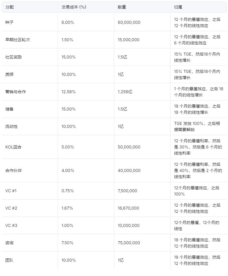 - 总供应量分配给种子轮、社区奖励、质押、营销、储备金、流动性、KOL 及 VC 等不同板块,并设有解锁时间与 Cliff 期,保障市场稳定性。