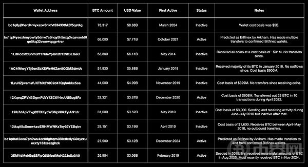 以下是最大的未归属比特币持有者表格,显示其持有的比特币数量、占流通供应量的百分比、钱包状态以及对钱包的观察。