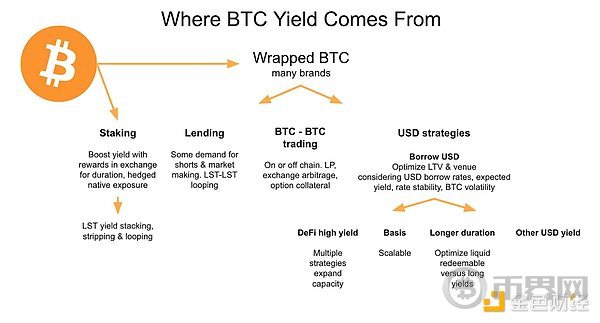 比特币是全球最活跃、流动性最强的市场之一。这些市场的参与者可以通过交易比特币赚取流动性(LP)和套利费用。他们可以在交易不同类型比特币的资金池中提供LP头寸,或在将比特币与其他资产进行交易的资金池中进行对冲,或者进行跨链做市。他们可以使用比特币作为永续合约和期权交易策略的保证金。以收益为重点的衍生品策略通常会出售期权以满足杠杆需求。