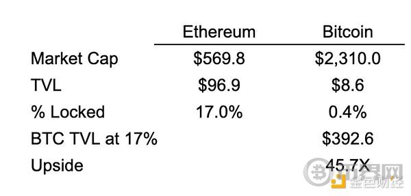 相比之下,比特币的收益似乎才刚刚起步。以太坊的TVL相当于以太坊市值的17%,而比特币的TVL仅为比特币市值的 0.4% 左右(根据DeFi Llama数据):