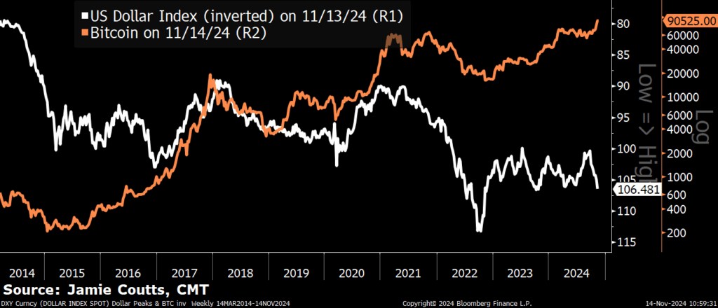 在 Jamie Coutts 分享的图表中,全球 M2 货币供应量的增加与比特币价格的上涨有关。