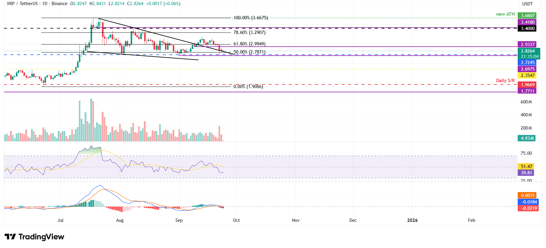 - 本周迄今为止,XRP 已回调近 5%,目前徘徊在 2.83 美元左右。