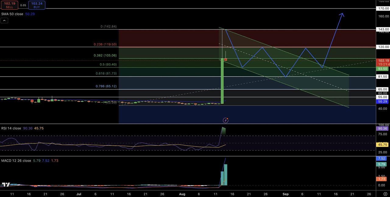 从结构上看,这一走势类似于潜在牛市旗形形态中的垂直旗杆。如果价格在 81 美元至 120 美元之间窄幅盘整,则可能进一步上涨至 143 美元,并最终达到绘制路径预测的 170 美元心理关口。如果价格突破 170 美元,下一个目标将是 200 美元大关。