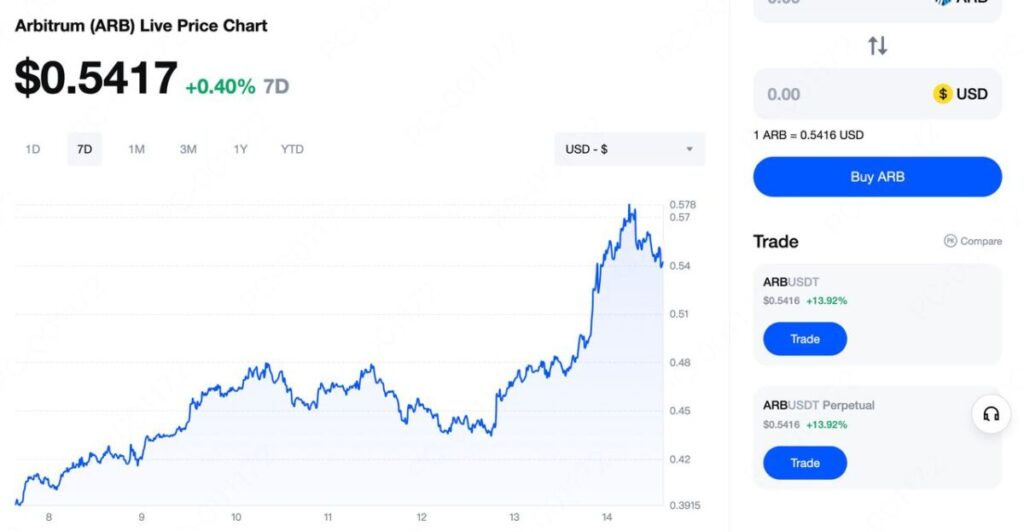 - 价格走势:ARB 当前价格 0.5417 美元,24 小时涨幅 13.9%。
