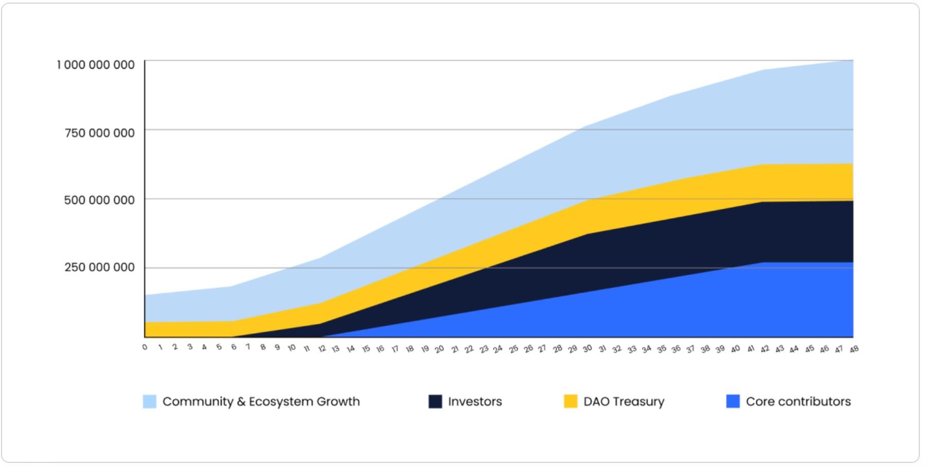 AZUR是Azuro的原生代币,今年六月份正式上线主网,总供应量10亿枚。根据官方公布的代币经济模型,代币分配如下: