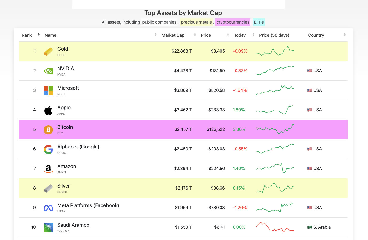 比特币已超越 Alphabet(谷歌),成为市值第五大的资产(截至 2025 年 8 月 14 日)。数据来源:公司市值