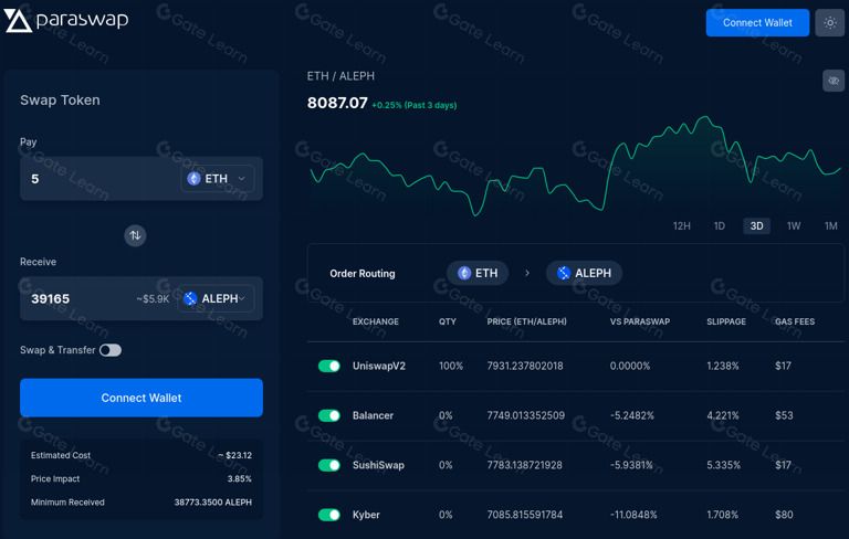 ParaSwap 被公认为一项重要的创新。它是一个去中心化交易所(DEX)聚合器,将多个DEX的优势集成到一个强大而用户友好的平台中。本质上,ParaSwap 是一个桥梁,将用户连接到DeFi生态系统中可用的各种流动性来源。这种技术使用户能够高效地进行代币交换和交易,并有可能获得比单一交易所更好的利率。ParaSwap 的设计宗旨是既易于上手,又满足资深交易者寻求的功能深度,使其适用于所有级别的加密用户。