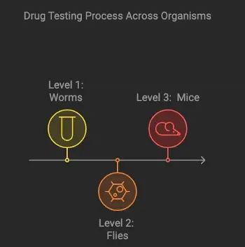 - 第三阶段:小鼠测试(啮齿类)– 如果化合物在线虫和果蝇中显示效果,将进入小鼠测试阶段,这是更接近人类研究的模型。