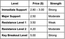 - 如果成交量在2.80美元附近出现激增,将表明买家兴趣强烈,确认潜在的趋势反转和向4.00美元或更高水平的反弹。
