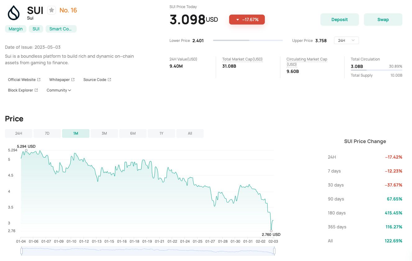 SUI是一个为高性能和可扩展的链上应用而设计的创新型区块链平台,已吸引了大量投资者的关注。截至今日, SUI的交易价格为3.108美元 , 市值 为 95.8亿美元 , 24小时交易量 为 940万美元 。尽管最近价格下跌了17.35%,但SUI展现出长期韧性,在过去180天内涨幅达413.86%,过去一年涨幅达115.6%。