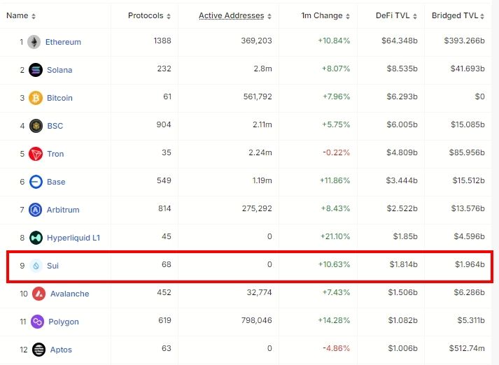 截至2025 年7 月,Sui 公链在DeFi 领域的总锁仓资金(TVL)已达18.1 亿美元,全球排名第9,超越AVAlanche、Aptos 等同类竞争链,展现强劲的资金吸引力与协议建构能力。对比去年同期,TVL 成长幅度接近10 倍,维持高速扩张态势。