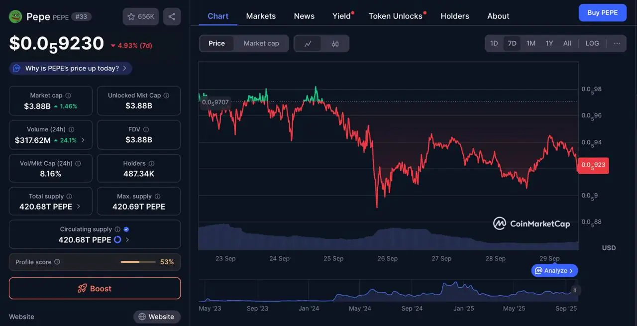 在最近的阅读中,PEPE看起来更中性而非看涨:买家正在捍卫 0.0000090 美元至 0.0000093 美元的区域,而供应上限在 0.0000098 美元至 0.0000106 美元附近反弹,14 天RSI