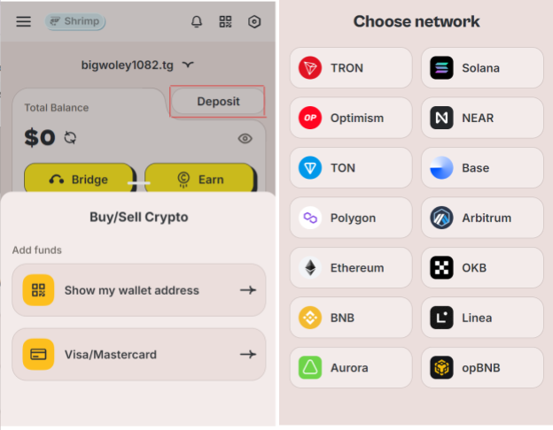 HOT Wallet支持来自NEAR、Tron、Base、SOLana、以太坊(EVM)、TON等热门区块链的加密货币存款,并支持通过借记卡(Visa和MASTERCard)进行法币存款。