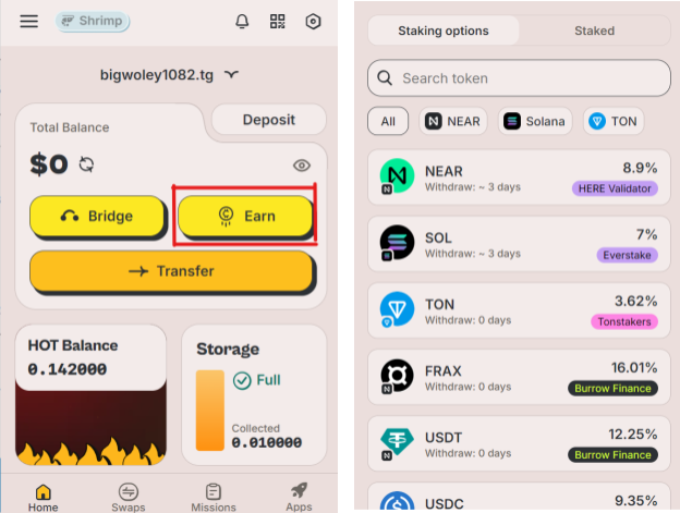 在“赚取”功能下,用户可以访问NEAR、SOL、TON、FRAX、USDT等资产的质押池。