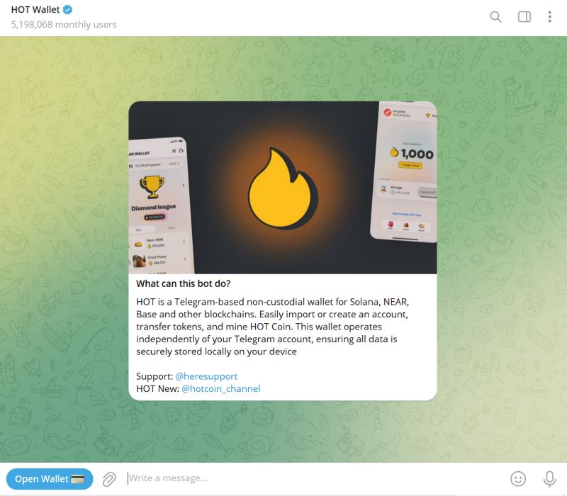 Telegram上的HOT钱包是一个完全基于区块链的非托管钱包。它是新一代的Telegram钱包,用户可以在这里创建账户、进行加密货币交易,并赚取$HOT代币。