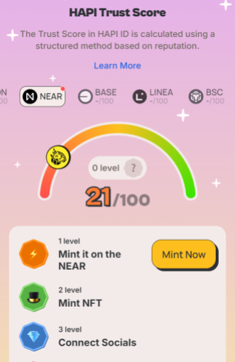 HAPi Trust Score用于计算用户在NEAR区块链上的活动和贡献。