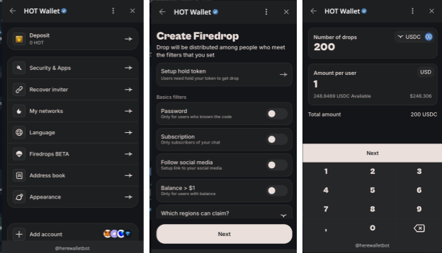 Firedrop是钱包中的一个功能,允许用户向他人分发代币。这个独特的方法让发送者可以设置条件,决定谁可以领取代币。Firedrop代币可以在HOT Wallet支持的任何网络上领取。