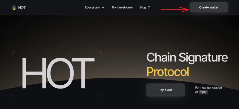 - 访问Hot Protocol网站,在右上角点击“创建钱包”。您也可以使用朋友提供的推荐链接,但请务必查看验证徽章以确认链接的真实性。
